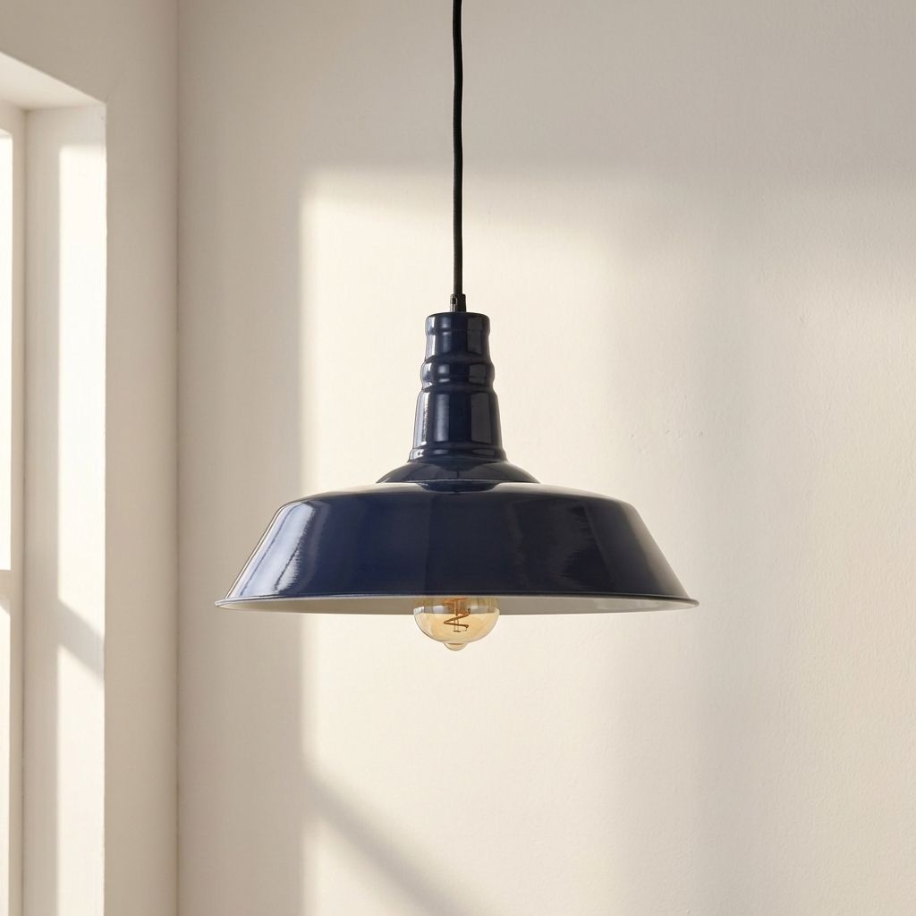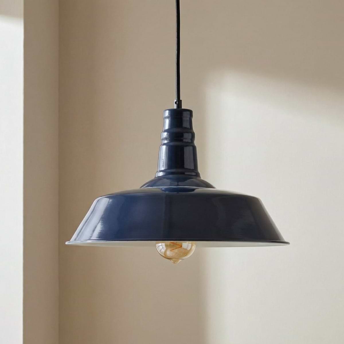 Our medium size stunning Argyll Pendant in Squid Ink Blue. Perfect for creating a vintage warehouse, country, retro or industrial look in smaller spaces. Its wide, yet shallow pan shade and straight angular lines provide a masculine tone and these lights are particularly suited to setting in rows to create statement lighting. The inside of the shade is finished in classic off-white, to enhance light output.