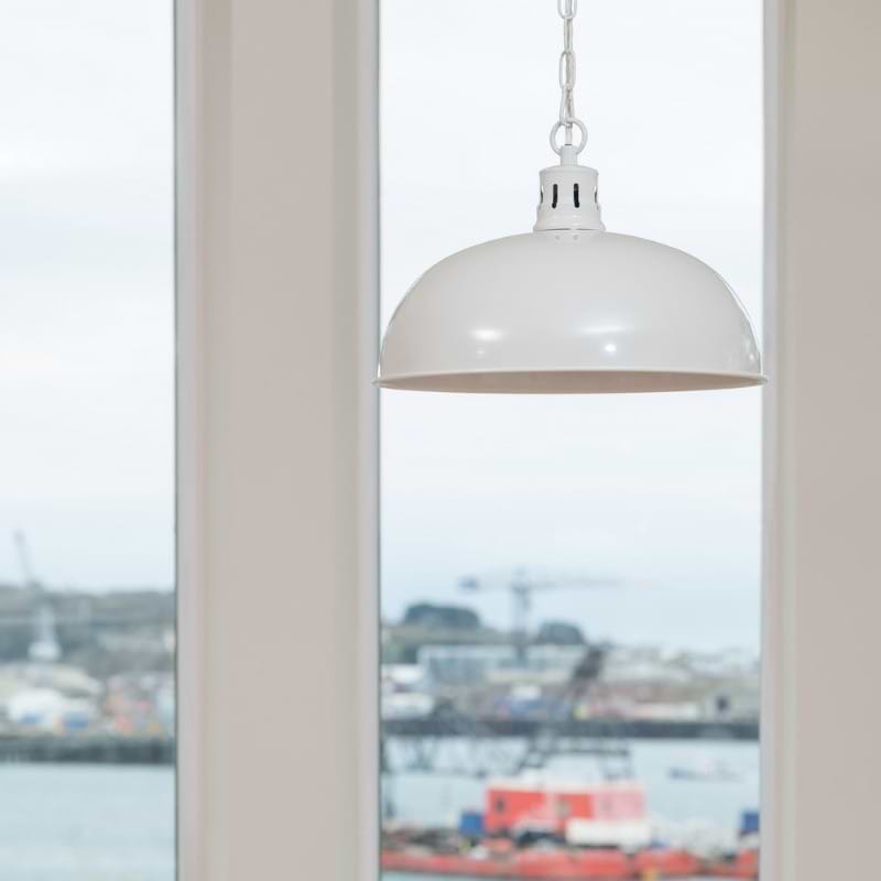 This is the Berwick Rustic Dome Pendant exterior in our Clay White finish. An exquisite, timeless tone that will complement most colour schemes. With a near-white colour that looks like a limestone or clunch stone, this light offers a soothing style that fits in many different decors. The interior of the shade is finished in a classic off-white, for exceptional light output.