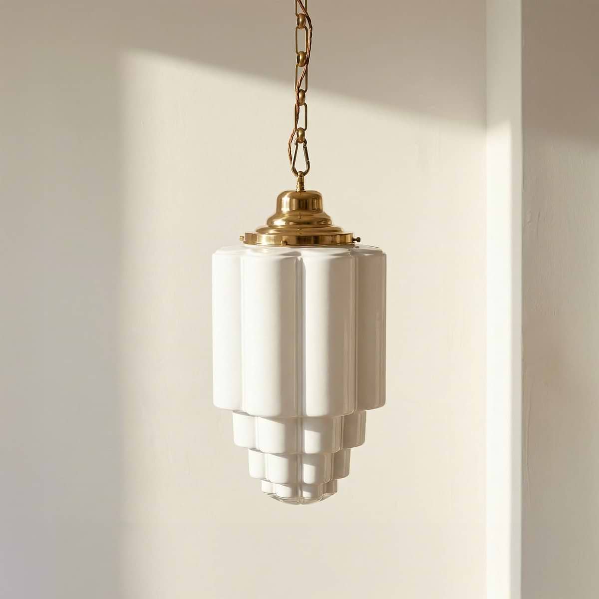 Elevate your extraordinary home with the Glasshouse Polished Brass Opal Pendant Light, a masterpiece of meticulously crafted design inspired by a rare 1900s moulding. This breath-taking Art Deco pendant light offers an unrivalled blend of vintage authenticity and timeless elegance, perfectly suited to grace any stylish luxury interior. The premium, thick antique-style glass is available in exquisite clear glass to maximise light distribution or beautifully aged opaque glass to establish a softer, inviting ambience. Complementing the glass is an elegantly designed, solid brass cap and a generously proportioned three-metre chain, available in an array of luxurious finishes including polished brass, lacquered aged brass, and polished nickel. For those who appreciate natural character, the ungalvanised polished brass option offers a uniquely reflective, period-correct aesthetic that gracefully develops a beautifully dulled patina over time, or it can be occasionally polished to retain its rich, honeyed brilliance. As a hallmark of authentic vintage brass lighting, slight variations in the hand-crafted finish guarantee that each piece is truly unique. Bring exceptional luminosity and architectural interest to your dining room or grand hallway with this captivating opal glass pendant.