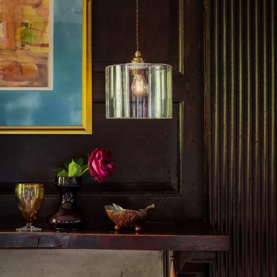 This petite clear glass pendant light delivers equally with an understated charm. It's hand blown clear glass cylindrical shade casts out in every direction saturating an interior in ambient light.