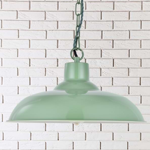 This is the Portland Reclaimed Style Industrial Pendant exterior in our Chalk Green finish. This soft, muted green emanates a warm calm and brings elegance to both period and contemporary settings. This is a perfect dining room, kitchen or breakfast room green. This light is handmade to mimic a traditional or period enamelled look.
