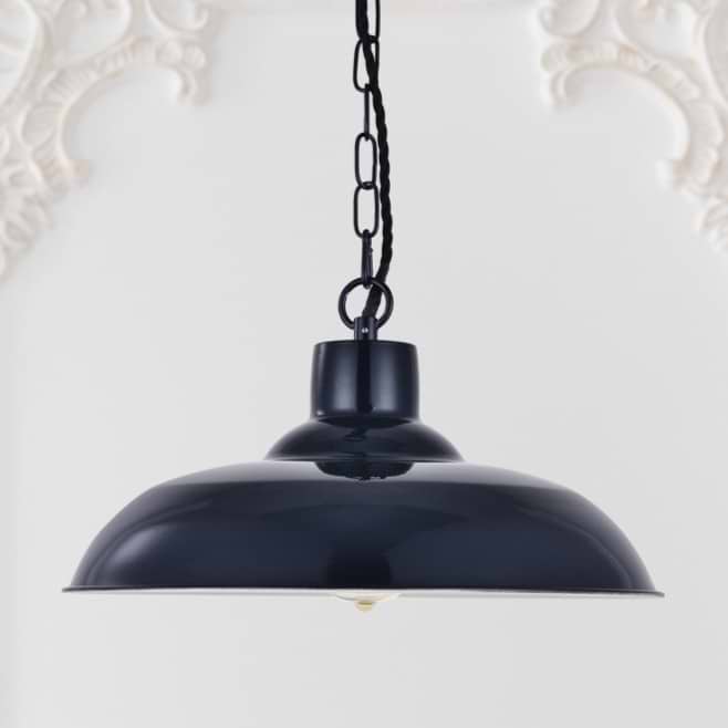 This is the Portland Reclaimed Style Industrial Pendant exterior in our Squid Ink Blue finish. This luxurious, deep midnight tone of blue black looks spectacular in both period and contemporary settings. This light is handmade to mimic a traditional or period enamelled look.