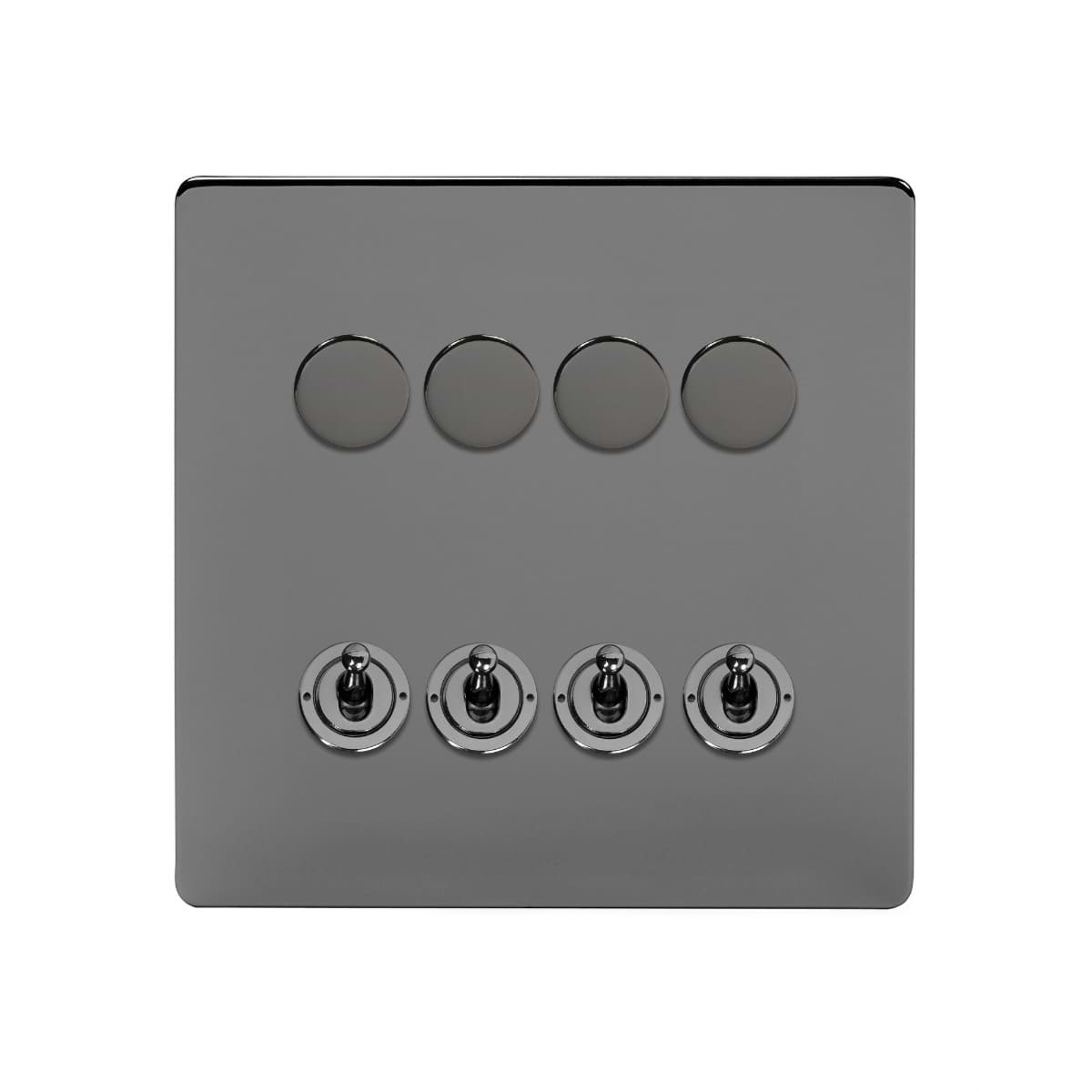 This Soho Lighting 8 Gang Screwless Light Switch with 4 dimmers and 4 toggles is made up of 4 x 150W LED (300w Halogen/Incandescent) Intelligent Dimmer and 4 x 20A Toggle 2 Way Switch.