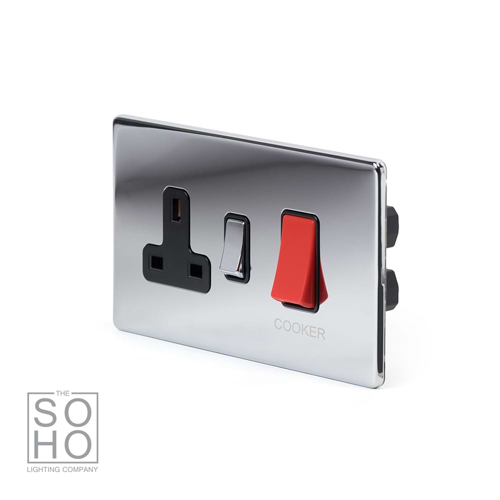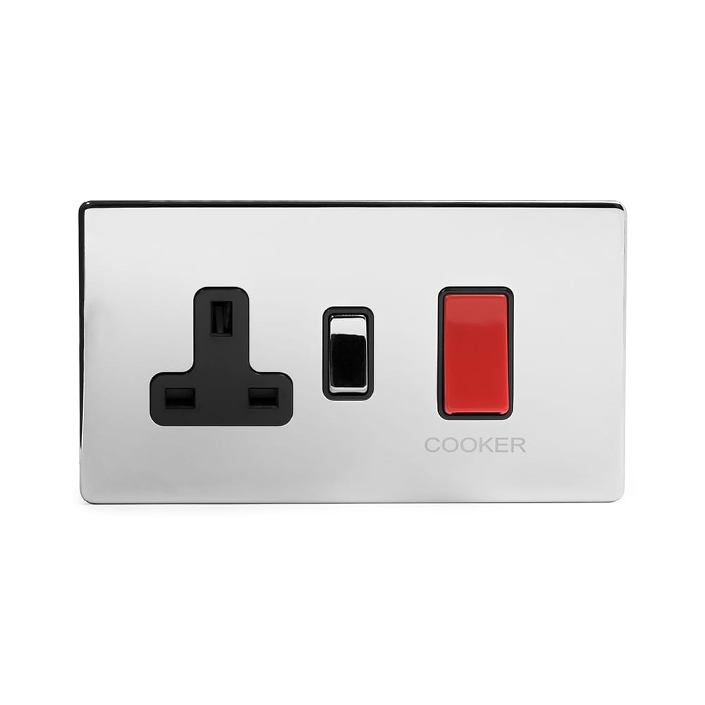 Polished Chrome is generally considered to suit modern/contemporary styles. However, this Polished Chrome 45A Cooker control With Black insert also complements period styles such as art deco, arts and crafts and other homes of distinction. It looks particularly striking when set against darker finishes, wood or panelling. This Polished Chrome Cooker Switch With Socket is a popular choice for kitchens as it often harmonises with other polished chrome fittings, such as taps and appliances.