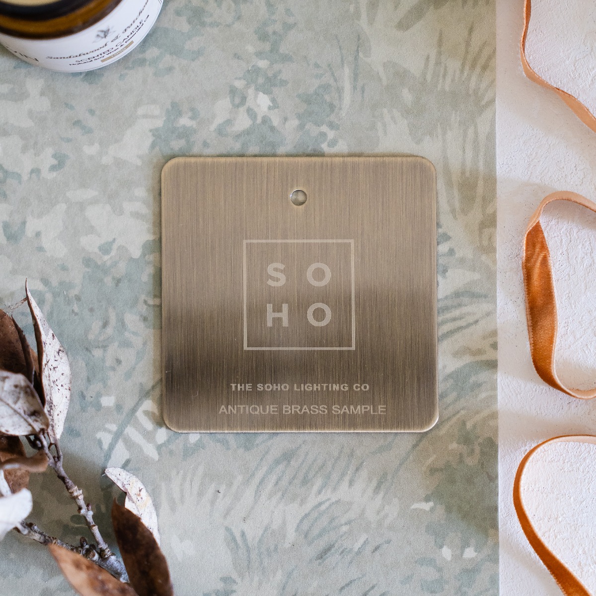 This warm Antique Brass metal finish sample combines traditional brass colour and subtle ageing. Its rich, heritage tone offers a grounded, timeless presence in any room.
